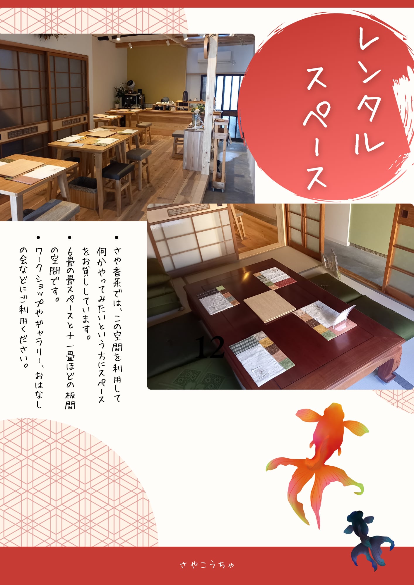 さや香茶では、この空間を利用して何かやってみたいという方にスペースをお貸ししています。6畳間の畳スペースと11畳ほどの板の間空間です。